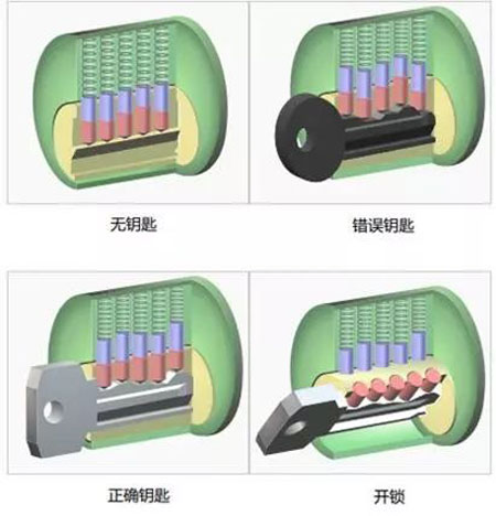 原理其實(shí)很簡(jiǎn)單。上圖的鎖共有五對(duì)彈子(即五個(gè)上彈子、五個(gè)下彈子),在相應(yīng)的彈子孔中可以上下滑動(dòng)。當(dāng)正確的鑰匙插入時(shí),五個(gè)上彈子從鎖芯退回鎖體,正好同鎖芯與鎖體的接觸面平齊,此時(shí)鑰匙帶動(dòng)鎖芯轉(zhuǎn)動(dòng)便可以開鎖。如果鑰匙不匹配的話,彈子就會(huì)卡在兩者的接縫處,鑰匙自然打不開了。