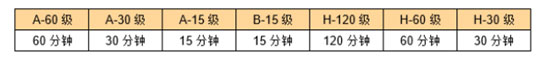 ● A級(jí)、B級(jí)和H級(jí)防火門(mén)應(yīng)在其隔熱等級(jí)對(duì)應(yīng)的時(shí)限內(nèi)滿足隔熱性衡準(zhǔn),時(shí)限如下: